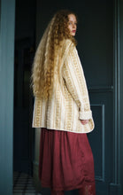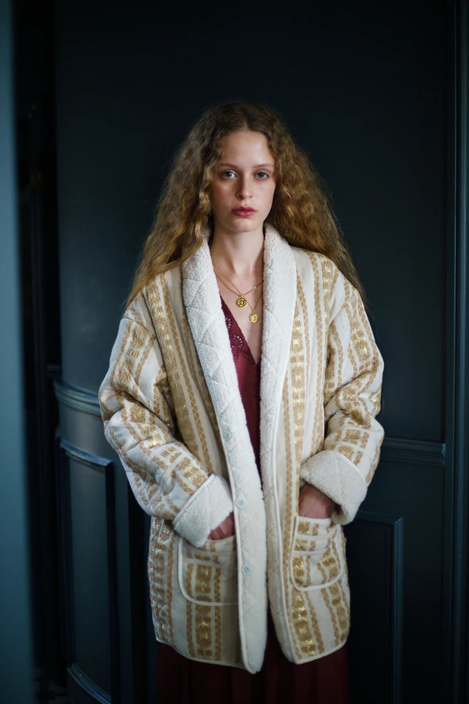 Nova is a quilted jacket made in a stunning cotton stripe jacquard with gold lurex thread and a sherpa fleece lining. The soft oyster, tan and gold tones work well over dresses and tops. Nova is finished beautifully with cotton tape trim around the pockets, cuffs, hem and front opening. The full sherpa fleece lining will keep you cosy and warm on festive nights out especially when paired with our evening wear. This versatile design can take you from day into evening looking equally as cool styled during the day with denim.