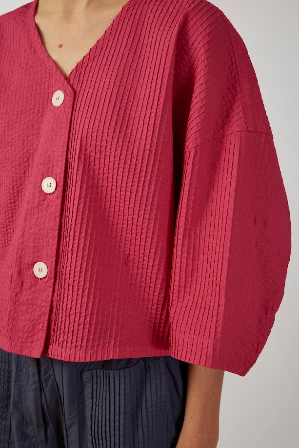 Crafted from soft cotton jersey, this Cropped Jersey Jacket is cut to a bold width balanced by its waistline length. It is designed without shoulder seams to allow the pintucks to run uninterrupted from cuff to cuff. The jacket features a lapel-style collar, a side split hemline, and three large buttons.