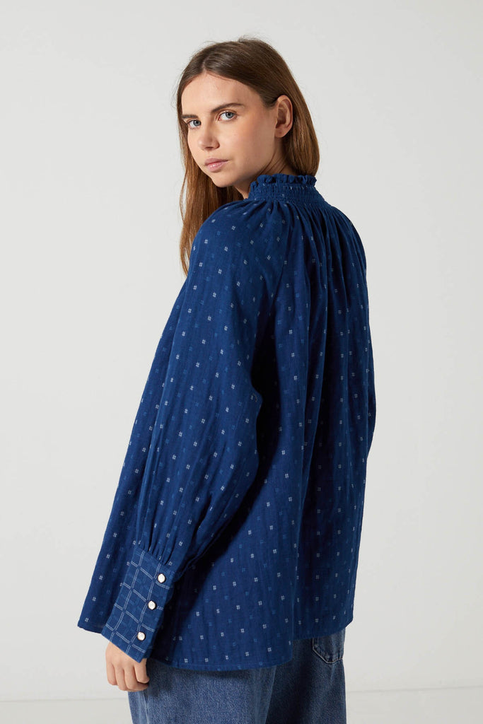 Its gathered collar with a smocked effect adds a touch of romantic femininity, while the intricate cuffs provide a subtle contrast.