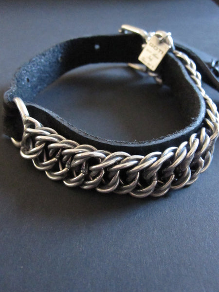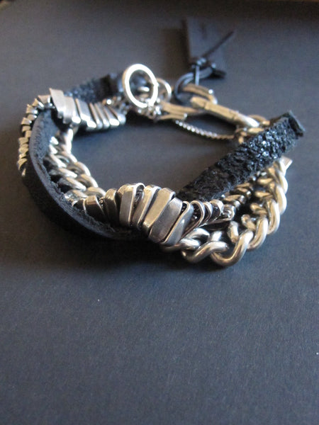 Goti multi silver chain and leather bracelet with spring action link closure and T-bar safety closure.Material: 925 Oxidised Silver and leather.length approx. 22cm Handmade in Italy. BR1168 In stock...