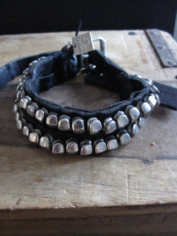 Goti double leather strap bracelet with silver nuggets, hand stitching detail and silver buckle closure.Material: 925 Oxidised Silver and leather. One Size : Variable Length with buckle first Hole 18cm,...