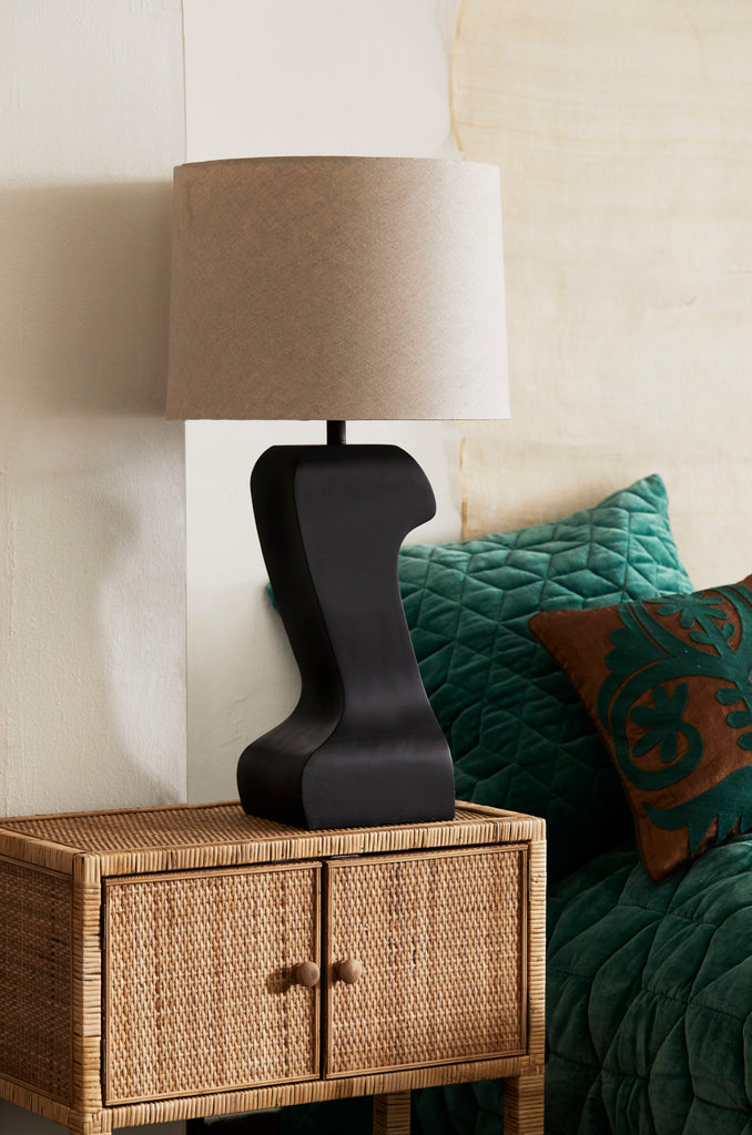We love the charm of this organic shaped lamp in stained wood. It adds perfect newness to anywhere you put it with its natural hemp shade.
