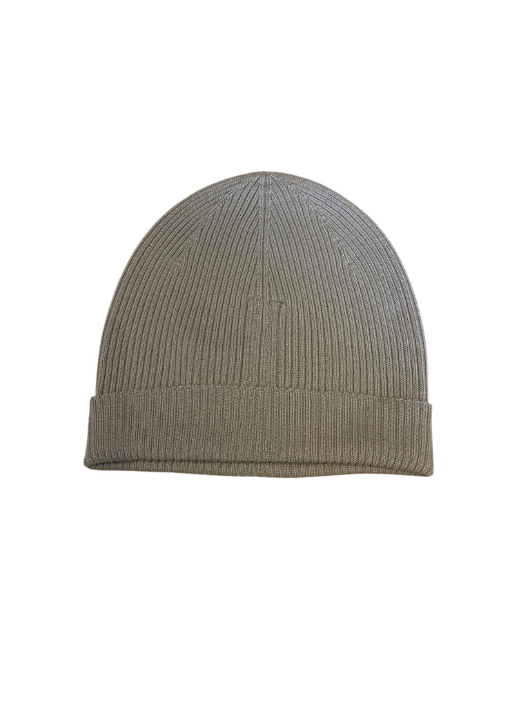 THIS RIBBED BEANIE IS A SMALL ROUNDED SHAPE IN A RIBBED KNIT, WITH A FOLDED UP EDGE. WHEN WORN IT FITS SNUGLY TO THE HEAD.