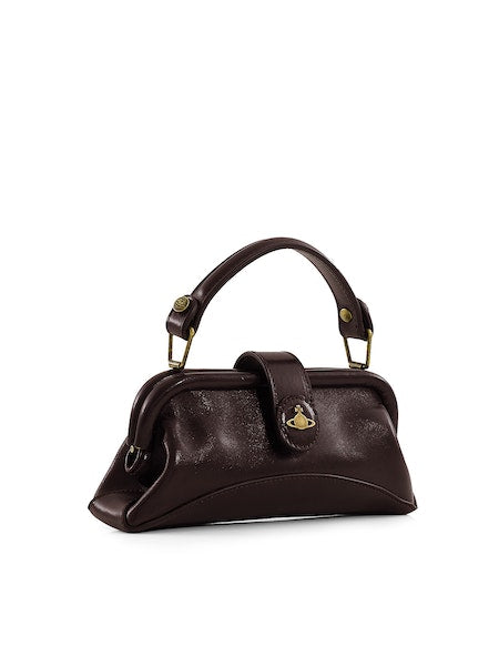 The Abbey phone bag is a new design made from polished black leather. This bag adopts a structured silhouette and an updated version of the iconic orb motif, which Vivienne Westwood used to represent launching tradition into the future, set on top of a leather tab.