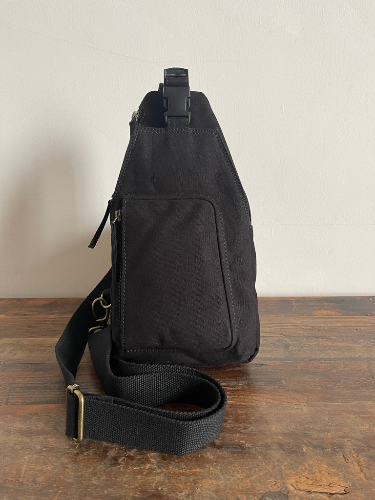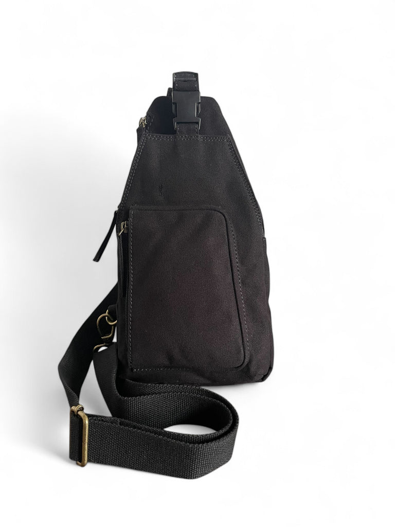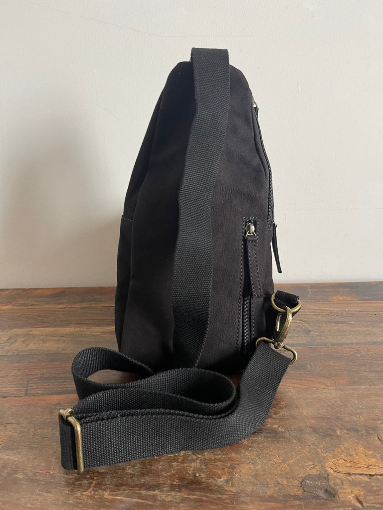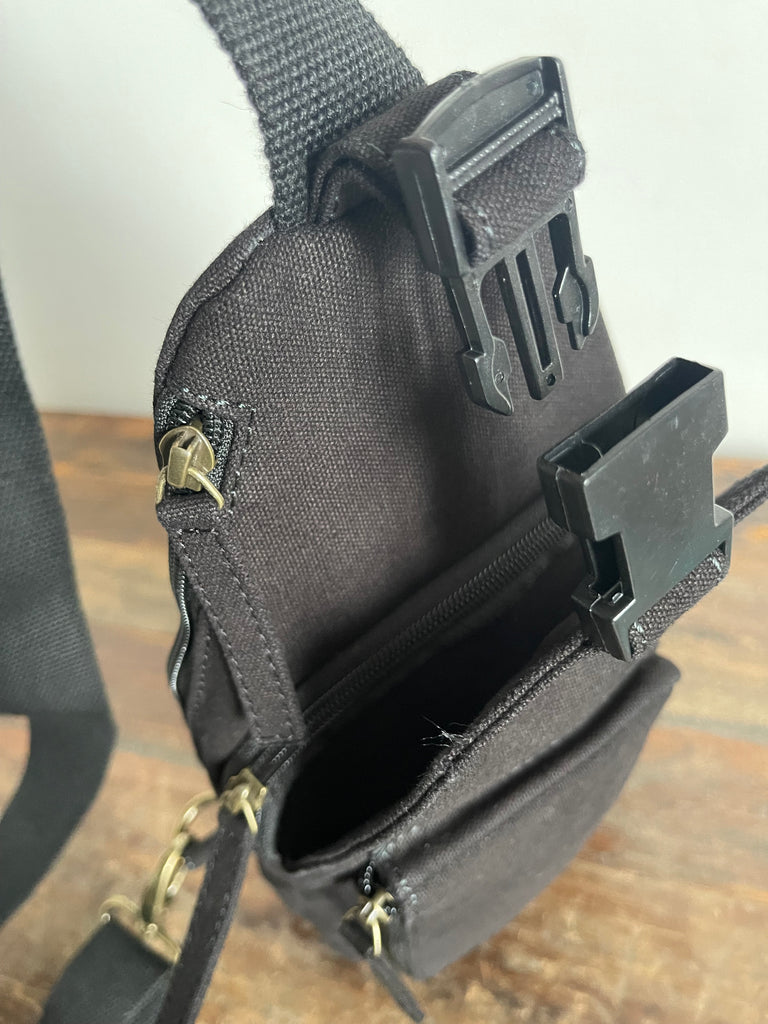 In canvas this unisex bag comes with an adjustable wide cotton shoulder strap. We think it’s the perfect essential. It has 4 zipped pockets. One on the front (18cm x 14cm) , one on the back (14cm x 12cm). Then 2 in the middle (one with 2 compartments - 30cm x 18cm at the widest part). Room for keys, phone, wallet, and other essentials.