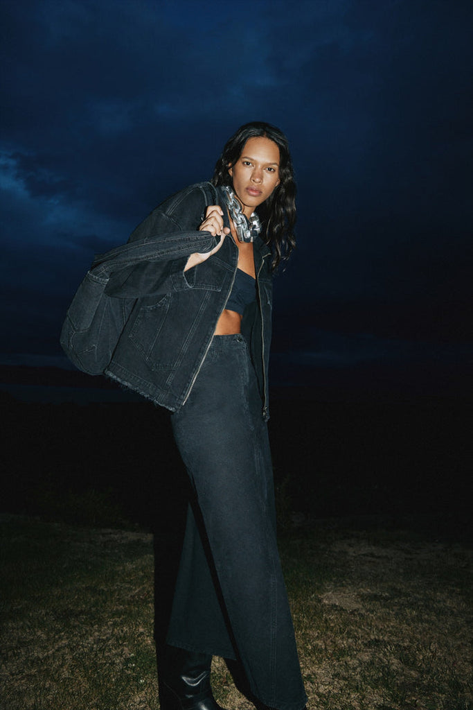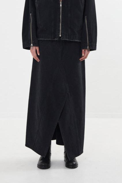 Crafted from black denim, the skirt is defined by a regular waist with belt loops, small side pockets and a zipper closure. The long, slinky silhouette is detailed with a cross-over front split and visible seams.