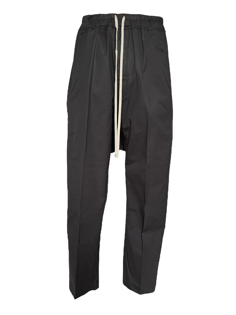 THESE DRAWSTRING LONG PANTS ARE FULL LENGTH WITH A DROPPED CROTCH. THEY HAVE AN ELASTICIZED WAISTBAND WITH DRAWSTRING, A CONCEALED FLY, AND PRESSED CREASES ON THE FRONT AND BACK LEG. THEY FEATURE TWO SIDE FRONT POCKETS AND TWO SQUARE BACK POCKETS WITH FLAPS AND TOPSTITCHING.