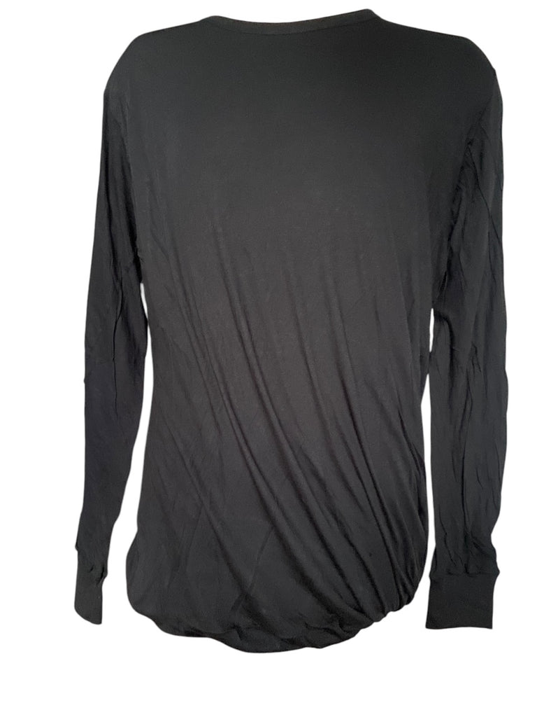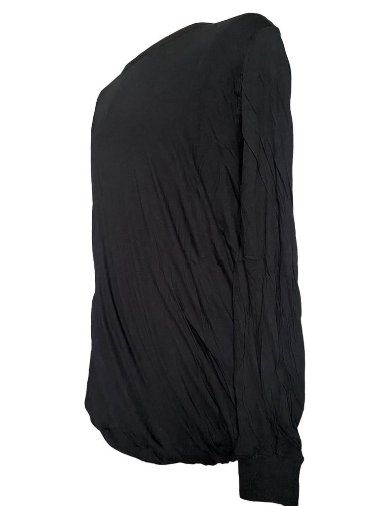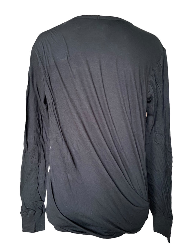 THIS DOUBLE LS T IS BELOW HIP-LENGTH AND HAS LONG SLEEVES AND A RIBBED ROUND NECK AND CUFFS. IT FEATURES A DOUBLE LAYER OF FABRIC, WITH THE HEM ON THE FOLD, CREATING A DRAPED EFFECT, AND THE SIGNATURE SINGLE SEAM RUNNING DOWN THE CENTRE BACK SPINE.