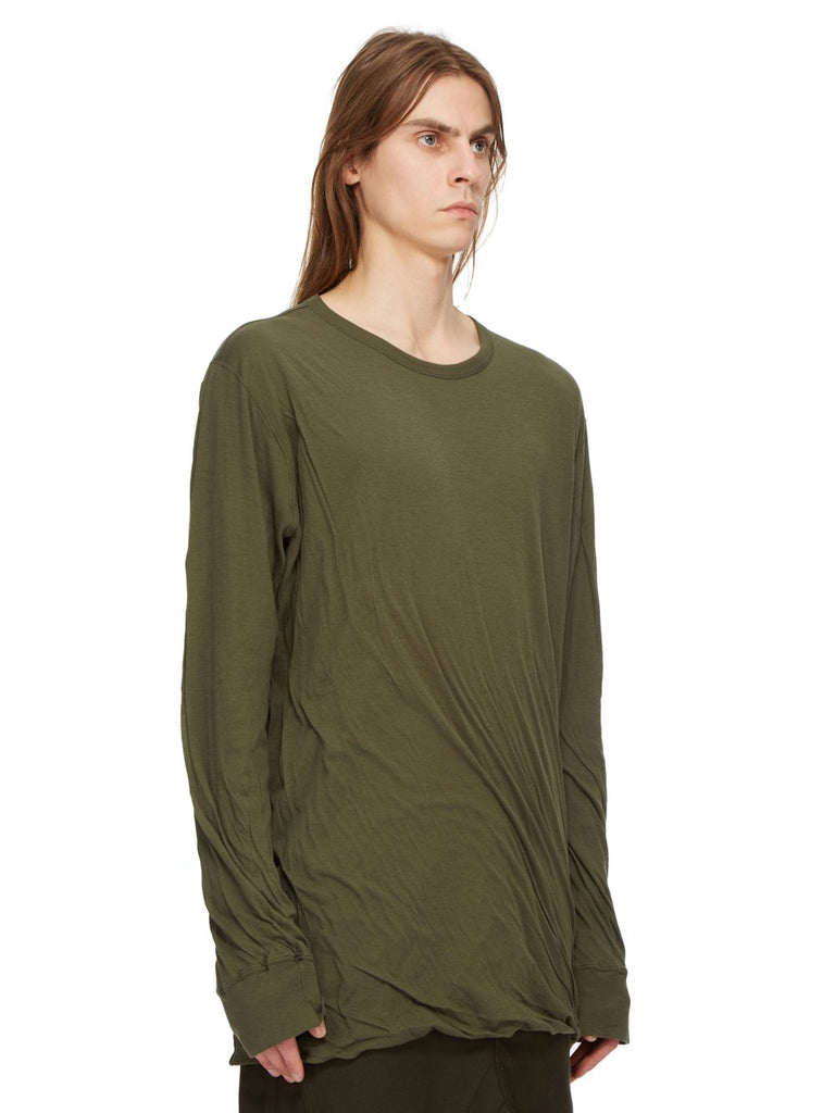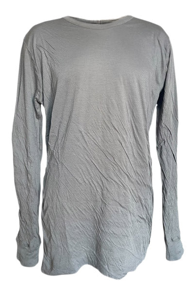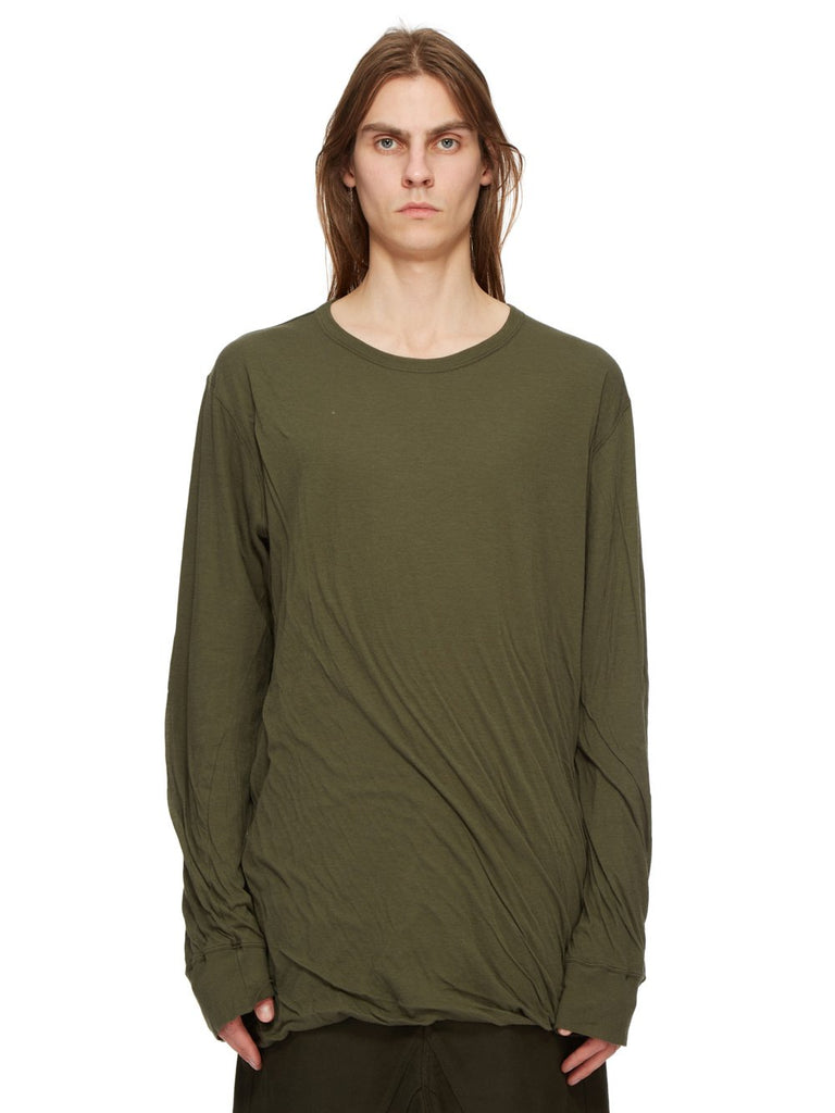 THIS DOUBLE LS T IS BELOW HIP-LENGTH AND HAS LONG SLEEVES AND A RIBBED ROUND NECK AND CUFFS. IT FEATURES A DOUBLE LAYER OF FABRIC, WITH THE HEM ON THE FOLD, CREATING A DRAPED EFFECT, AND THE SIGNATURE SINGLE SEAM RUNNING DOWN THE CENTRE BACK SPINE.