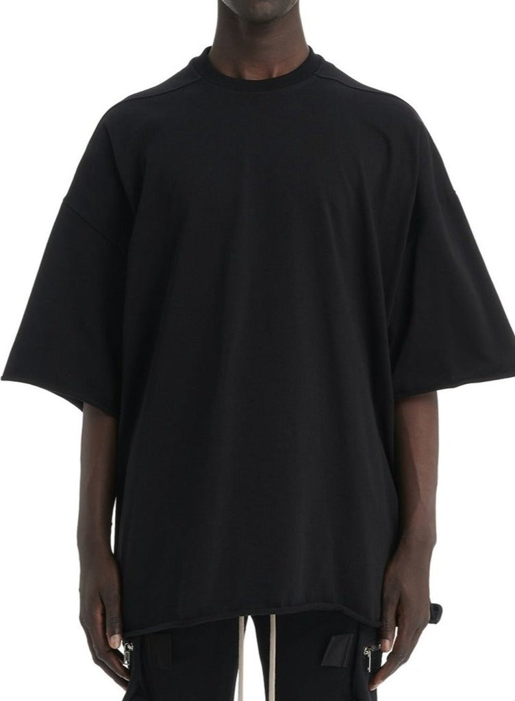 This Tommy T is below-the-hip length with a jumbo oversized fit. It has wide short sleeves with a dropped armhole, raw cut hems and a ribbed crewneck. It features signature front level shoulder seams and a centre back seam.
