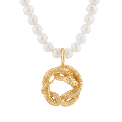 Recycled 925 Silver chain with imitation pearls and gold plated snake pendant. This necklace is elegant with a touch of edge, perfect as a gift to someone you love or just for...
