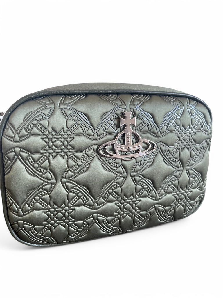 This simple yet chic style is crafted from premium satin look fabric in a repeat embossed ‘Orb’ design with polished silver tone accents. The secure top zip fastening reveals the contrasting recycled lining with two inner slot pockets, exterior zip pocket also features. Carry by the detachable leather strap on the shoulder or across the body. Iconic ‘Orb’ motif adds detail, signature Vivienne Westwood branding is seen throughout.