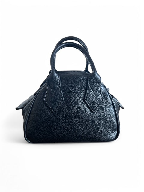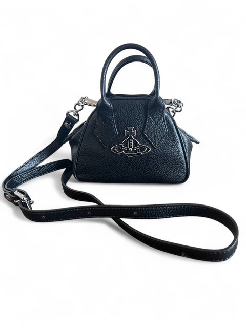 The Mini Yasmine Saffiano vegan grain bag honors the original 'Yasmine' silhouette from Vivienne Westwood's Autumn-Winter 1987/88 'Time Machine' collection. Named after designer Yasmine Eslami, who carried the first prototype, this mini version features a PU leather exterior and is accented by the iconic 'Thin Line Orb,' embodying Vivienne's vision of blending tradition with the future.