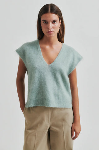 Second Female V-neck sleeveless pullover. Made in soft and stretchy mohair-wool blend with fluffy texture. Featuring a deep V-neckline and deeply cut armholes. Ribbed bottom hem. Small slits at sides....