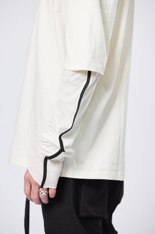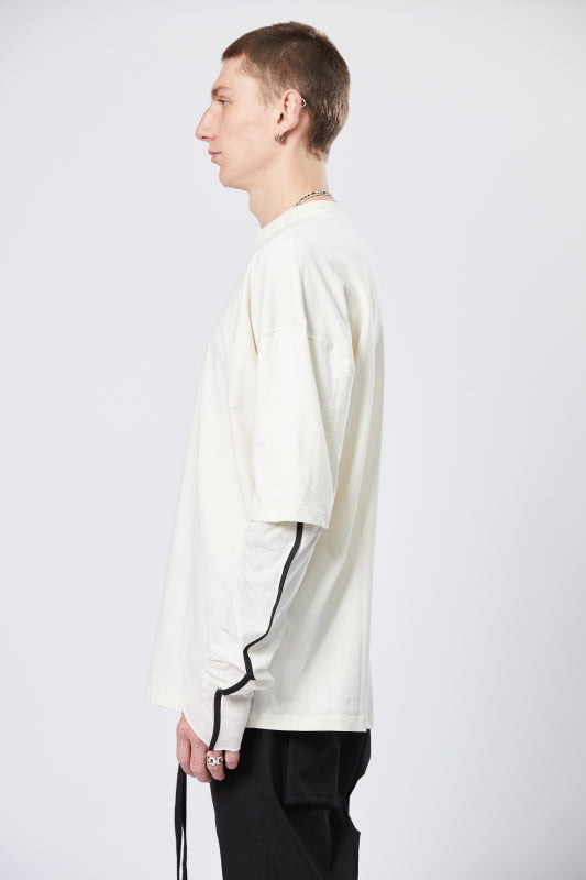 Round neck, cotton quality, doublestitching details, 2in1 layer look, oversized fit, overlapping shoulders sleeves in ultra light jersey quality contrast piping at sleeve