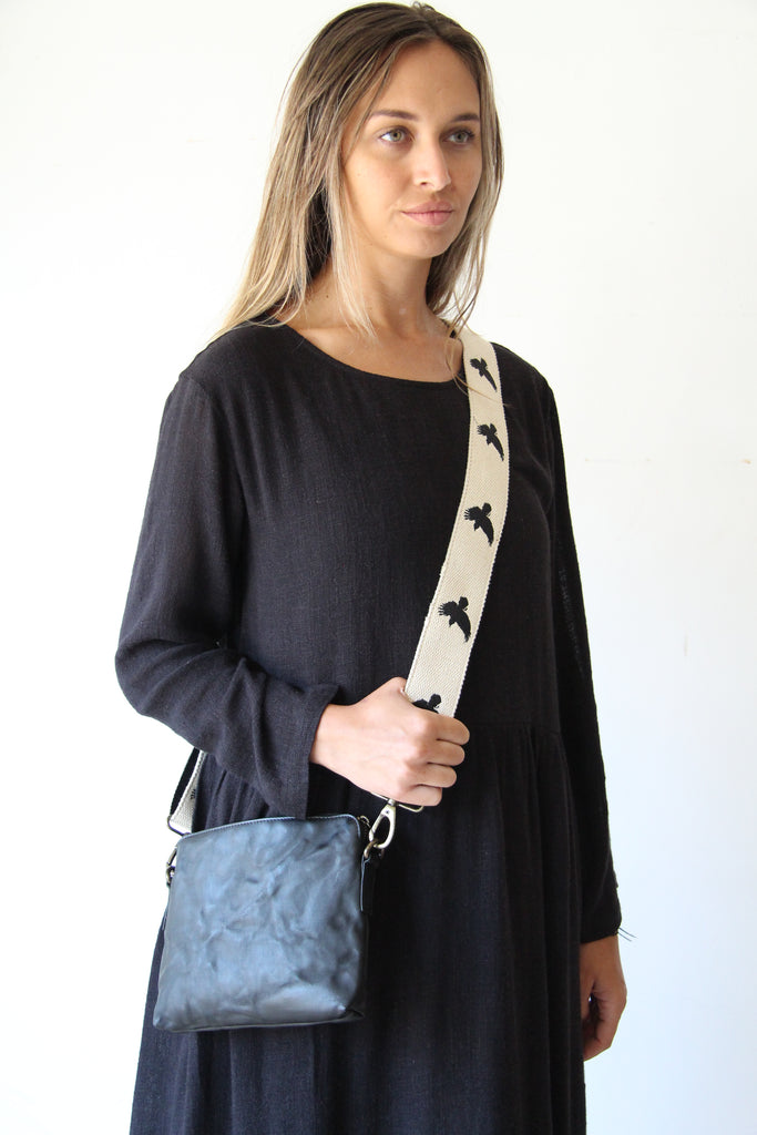 Stunning unisex bag in a cloudy textured leather, comes with an adjustable wide cotton shoulder strap with embroidered crow, along with a plain black webbed adjustable shoulder strap. Inside is a zip pocket and cotton lining. We think it’s perfect for the essentials.
