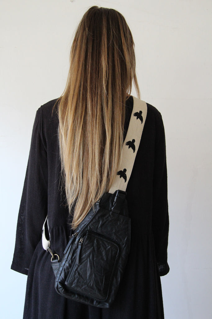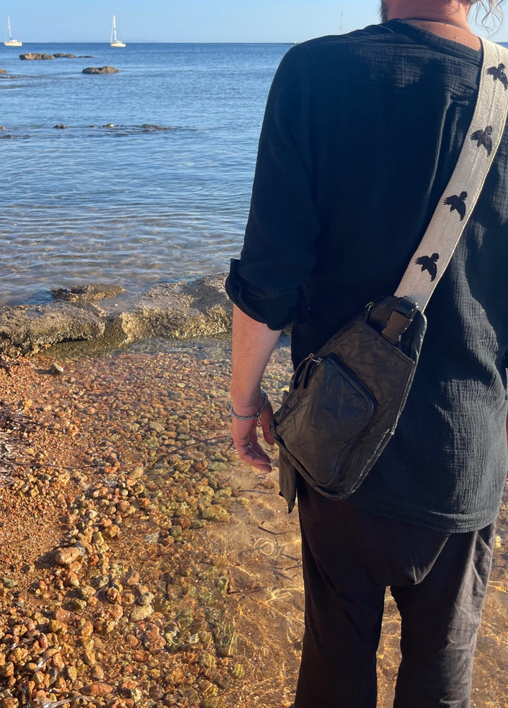 In cloudy textured leather this unisex bag comes with an adjustable wide cotton shoulder strap, detailing a crow design. We think it’s the perfect essential. It has 4 zipped pockets. One on the front (18cm x 14cm) , one on the back (14cm x 12cm). Then 2 in the middle (one with 2 compartments - 30cm x 18cm at the widest part). Room for keys, phone, wallet, and other essentials.