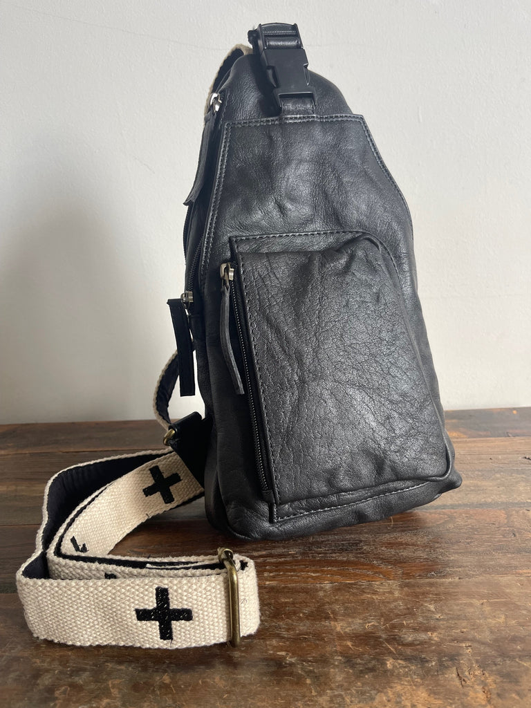 In cloudy textured leather this unisex bag comes with an adjustable wide cotton shoulder strap, detailing a cross design. We think it’s the perfect essential. It has 4 zipped pockets. One on the front (18cm x 14cm) , one on the back (14cm x 12cm). Then 2 in the middle (one with 2 compartments - 30cm x 18cm at the widest part). Room for keys, phone, wallet, and other essentials.